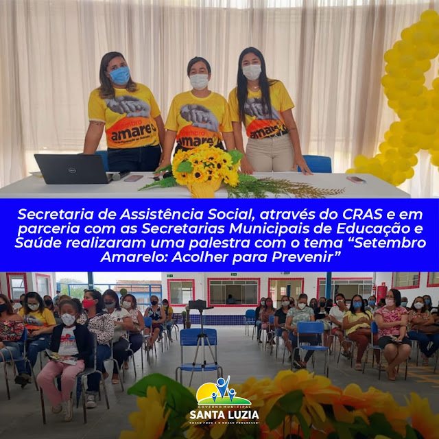 Em alusão ao Setembro Amarelo, a Secretaria de Assistência Social, através do CRAS e em parceria com as Secretarias Municipais de Educação e Saúde realizaram uma palestra na Creche Vovó Santa com todos os professores da Rede Municipal de Ensino, com o tema central “Setembro Amarelo: Acolher para Prevenir”. A palestra foi ministrada pelas psicólogas Wadlla Batista e Thiara Seara, onde tratou sobre o assunto “Suicídio: quebrando silêncios e acolhendo a vida”.